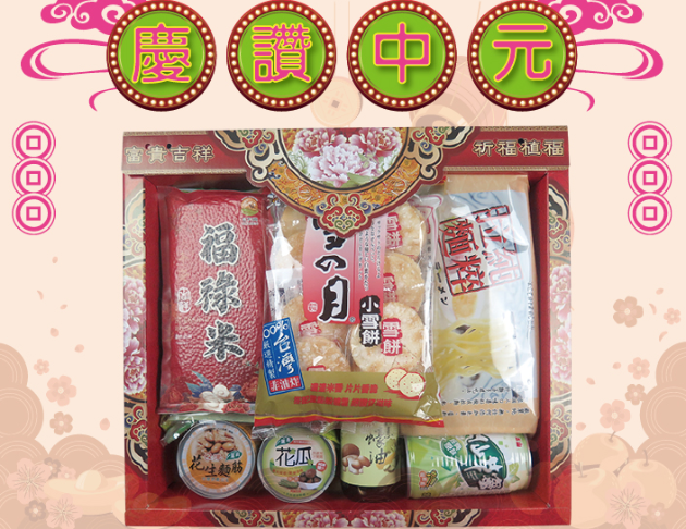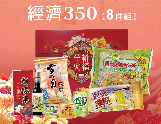 內容物:平安米300g、青葉米粉150g、青葉花瓜、泰山仙草蜜、雪月小雪餅、純粹拉麵、青葉Q彈花生麵筋、金蘭香菇素蠔油295ml。