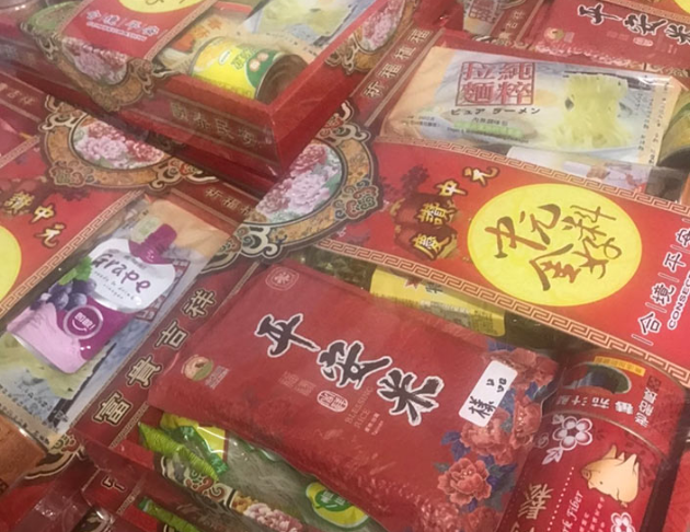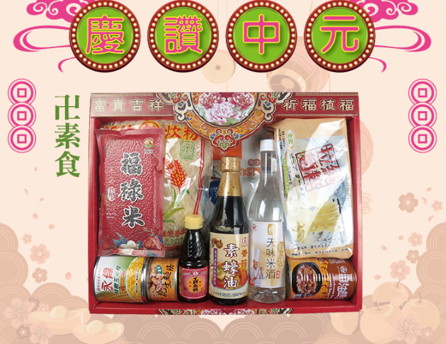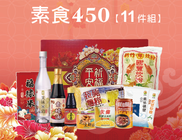 內容物:平安米300g、國豐米粉、青葉花生麵筋、廣達香麻油雙菇、天味米酒、純粹拉麵、工研香菇素蠔油、工研小烏醋、二號砂糖、廣達香永偉玉米粒、台灣美味鹽。
